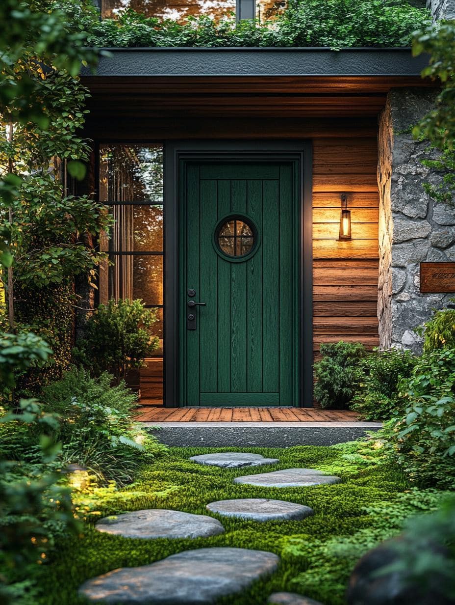 Pair your Forest Fern door with natural elements like wood, stone, or brick. This combination highlights the green color and provides a seamless transition from the outdoors to your cozy indoor space. Your entryway will look like a harmonious extension of the surrounding environment.